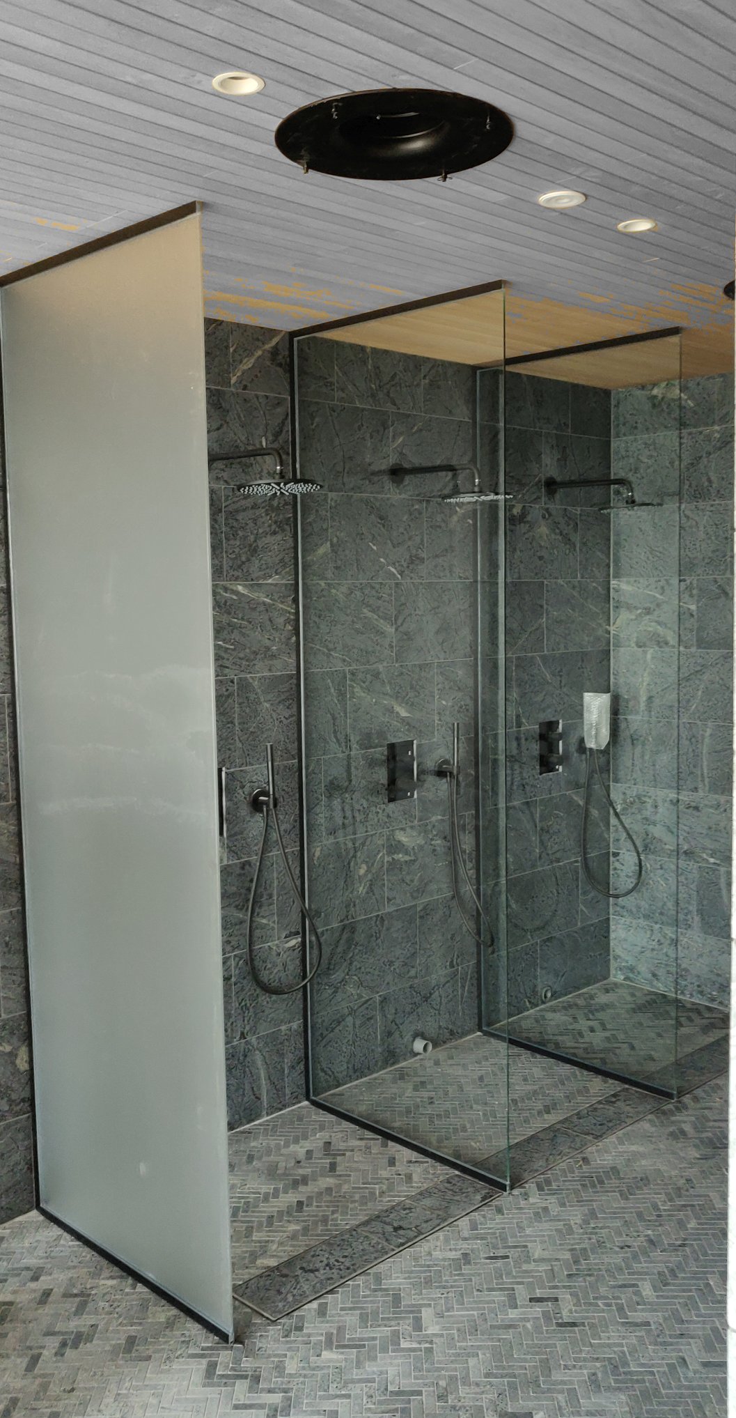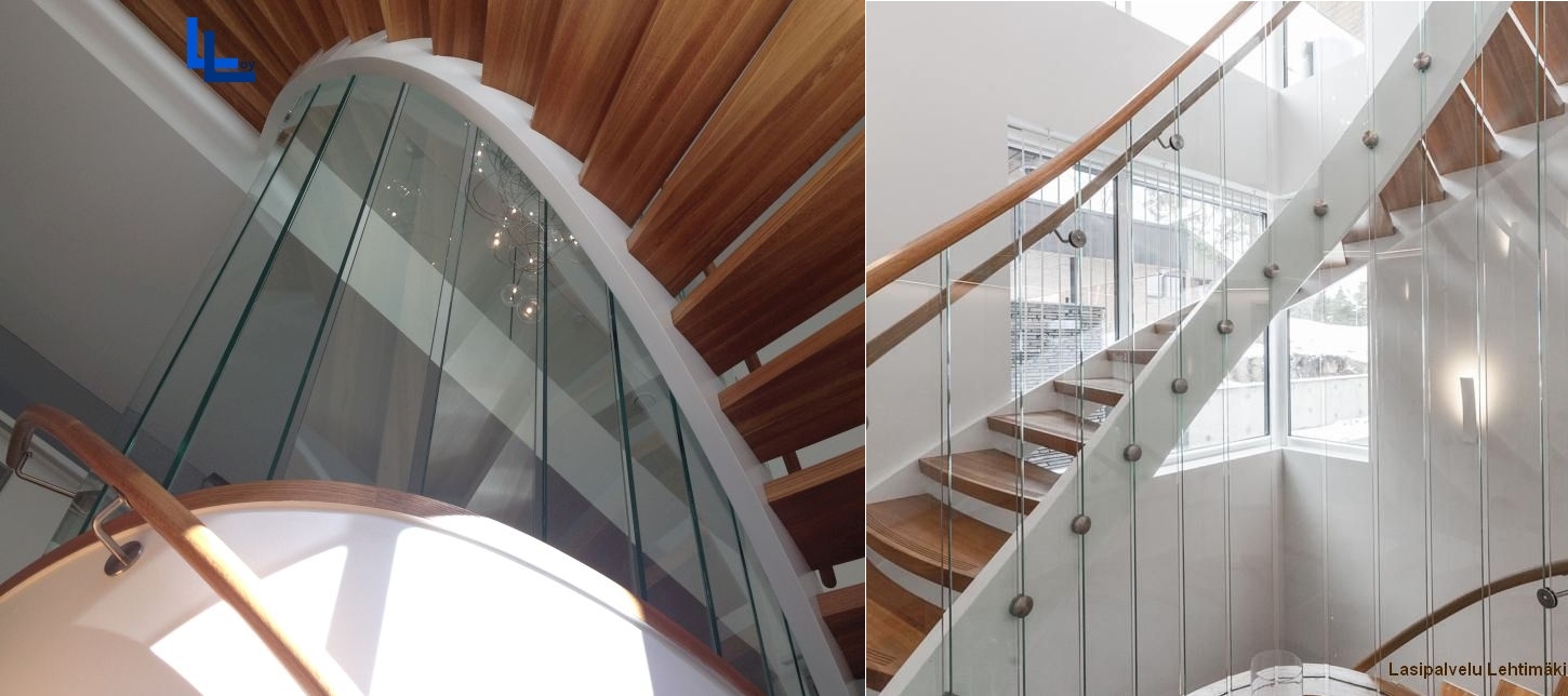 Arkkitehti oli suunnitellut kierreportaisiin lasikaiteen. Me toteutimme sen näin.