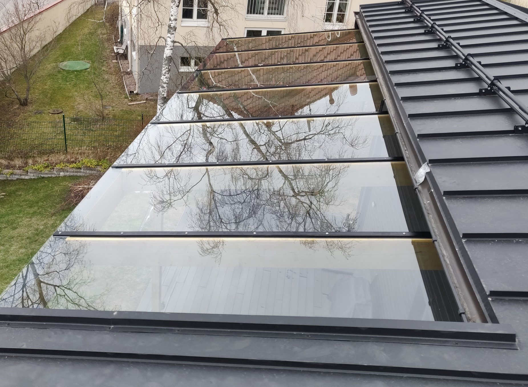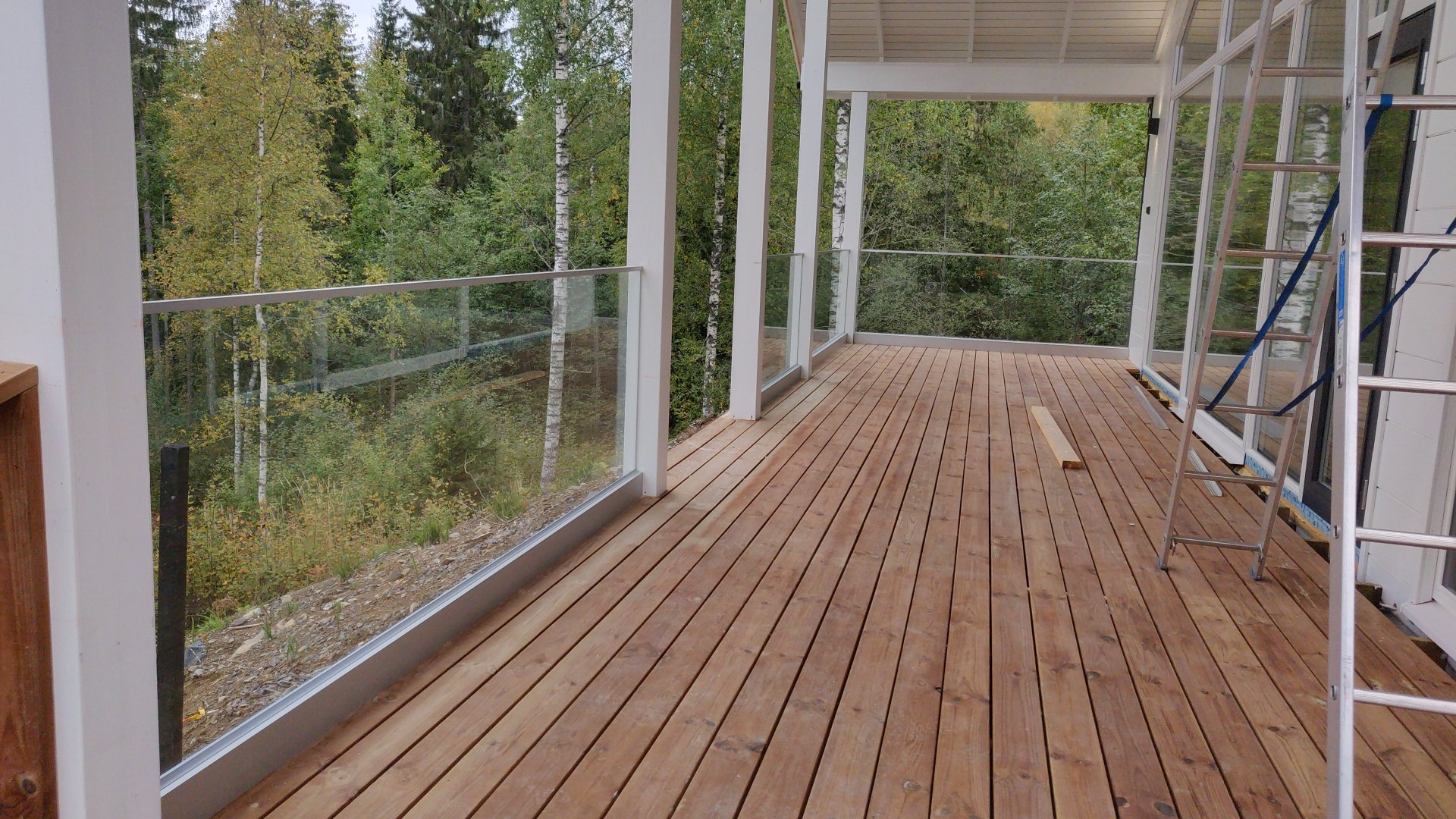 Lasinen kaide tuo avaruutta pieneen terassiin.